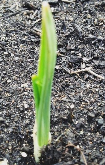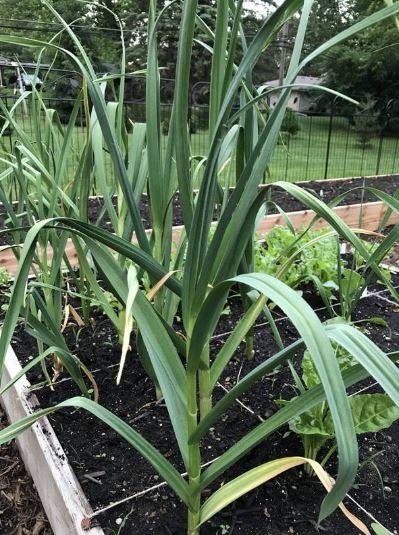 The vertical stalk that grows is refereed to as the "neck". With the hardneck varieties the stalk produces a distinct curled flower pod called a scape. The scape should be cut off before flowing to revert the energy to the bulb. Scapes are an edible bonus - sauteed in olive oil , tossed with Parmesan and red pepper flakes - yum! The stalk then becomes stiff and hard hence the name - hardneck.