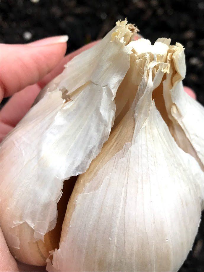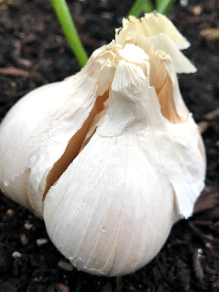 The vertical stalk that grows is refereed to as the "neck". With the hardneck varieties the stalk produces a distinct curled flower pod called a scape. The scape should be cut off before flowing to revert the energy to the bulb. Scapes are an edible bonus - sauteed in olive oil , tossed with Parmesan and red pepper flakes or turn into a simple yummy pesto! The stalk then becomes stiff and hard hence the name - hardneck.