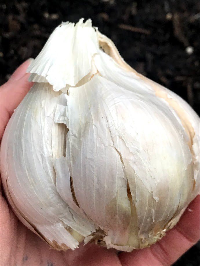Elephant garlic, Allium ampeloprasum var. ampeloprasum, looks like a jumbo garlic but is actually closer to a leek. Milder flavor than typical garlic but because of this you can you fresh in many dishes.